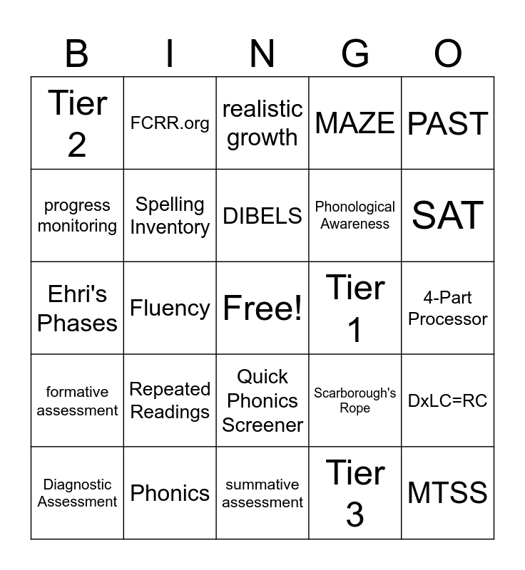This bingo card has a free space and 27 words: Scarborough's Rope, Screener, Phonological Awareness, summative assessment, progress monitoring, realistic growth, FCRR.org, formative assessment, Tier 1, DxLC=RC, Ehri's Phases, MAZE, Diagnostic Assessment, Phonics, SAT, ambitious growth, Spelling Inventory, DIBELS, Repeated Readings, Tier 2, 4-Part Processor, Tier 3, Fluency, MTSS, Quick Phonics Screener, PAST and Fidelity Checklist.