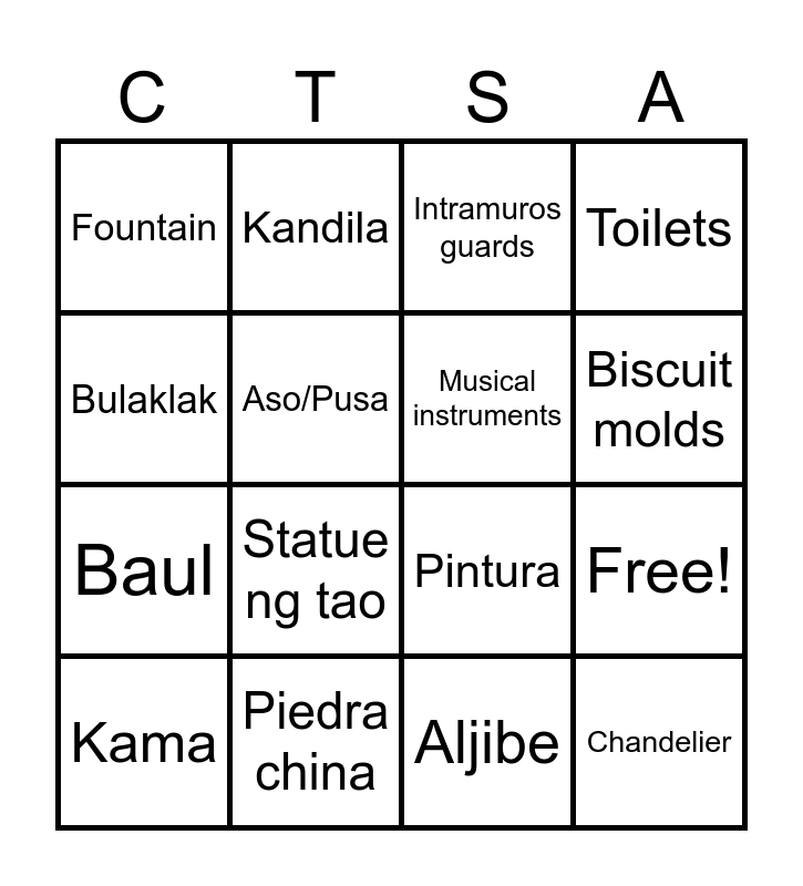 This bingo card has 20 words: Free!, Kalesa, Intramuros guards, Butaca, Kama, Bulaklak, Piedra china, Fountain, Baul, Kandila, Statue ng tao, Pintura, Aso/Pusa, Chandelier, Musical instruments, Punkah, Biscuit molds, Toilets, Aljibe and Church.