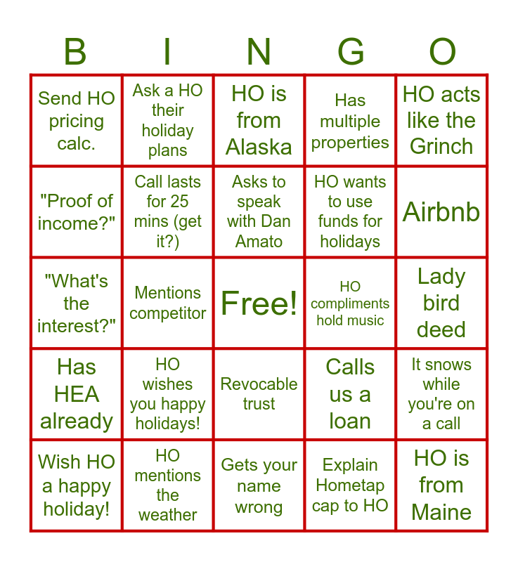 This bingo card has a free space and 24 words: HO wishes you happy holidays!, HO mentions the weather, Asks to speak with Dan Amato, Wish HO a happy holiday!, HO acts like the Grinch, Send HO pricing calc., "Proof of income?", Ask a HO their holiday plans, HO compliments hold music, Revocable trust, HO wants to use funds for holidays, "What's the interest?", Calls us a loan, It snows while you're on a call, Call lasts for 25 mins (get it?), Explain Hometap cap to HO, Lady bird deed, HO is from Alaska, Airbnb, Mentions competitor, HO is from Maine, Has HEA already, Has multiple properties and Gets your name wrong.