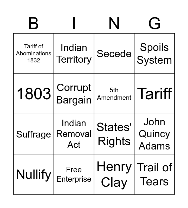 This bingo card has 27 words: Andrew Jackson, National Bank, Suffrage, Depression, Corrupt Bargain, Secede, Indian Territory, Trail of Tears, Free Enterprise, Worchester V Georgia, States' Rights, Spoils System, MM=JR, Gibbons V Ogden, Indian Removal Act, 10th Amendment, 5th Amendment, Tariff, Suffrage, Tariff of Abominations 1832, Henry Clay, John C. Calhoun, John Quincy Adams, Nullify, 1787, 1803 and Alexander Hamilton.