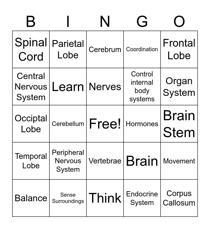 This bingo card has a free space and 24 words: Peripheral Nervous System, Sense Surroundings, Nerves, Balance, Frontal Lobe, Spinal Cord, Central Nervous System, Parietal Lobe, Hormones, Vertebrae, Control internal body systems, Occiptal Lobe, Brain, Movement, Learn, Endocrine System, Brain Stem, Cerebrum, Organ System, Cerebellum, Corpus Callosum, Temporal Lobe, Coordination and Think.