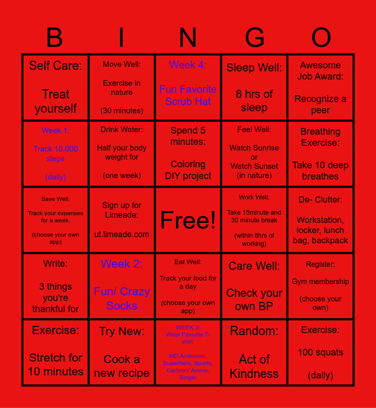 This bingo card has a free space and 24 words: Week 2: Fun/ Crazy Socks, Try New: Cook a new recipe, Spend 5 minutes: Coloring DIY project, Exercise: Stretch for 10 minutes, Awesome Job Award: Recognize a peer, Self Care: Treat yourself, Week 1: Track 10,000 steps (daily), Move Well: Exercise in nature (30 minutes), Work Well: Take 15minute and 30 minute break (within 8hrs of working), Eat Well: Track your food for a day (choose your own app), Feel Well: Watch Sunrise or Watch Sunset (in nature), Save Well: Track your expenses for a week. (choose your own app), Care Well: Check your own BP, Register: Gym membership (choose your own), Drink Water: Half your body weight for (one week), Random: Act of Kindness, De- Clutter: Workstation, locker, lunch bag, backpack, Week 4: Fun Favorite Scrub Hat, Breathing Exercise: Take 10 deep breathes, Sign up for Limeade: ut.limeade.com, Exercise: 100 squats (daily), Write: 3 things you're thankful for, Sleep Well: 8 hrs of sleep and WEEK 3: Wear Favorite T- shirt: MD Anderson, Superhero, Sports, Cartoon/ Anime, Singer.