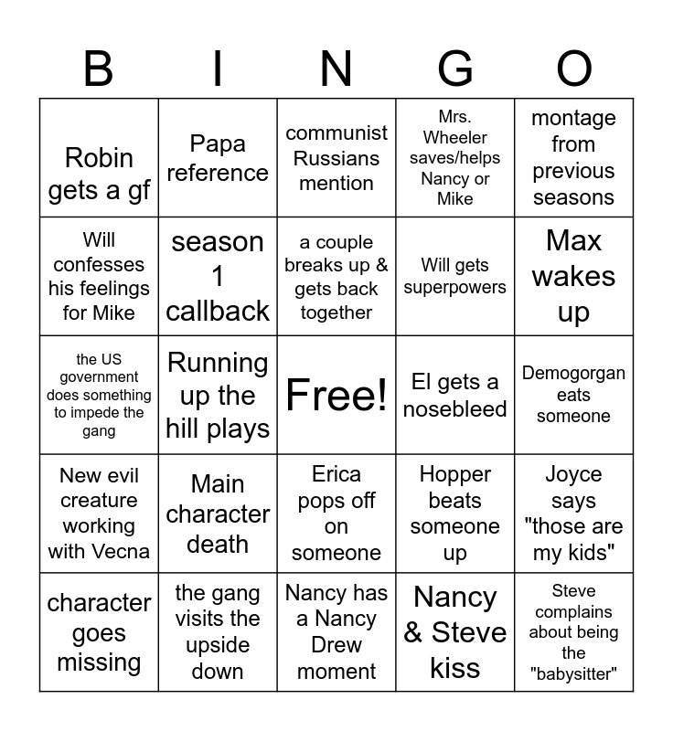 This bingo card has a free space and 24 words: Main character death, the gang visits the upside down, a couple breaks up & gets back together, character goes missing, montage from previous seasons, Robin gets a gf, Will confesses his feelings for Mike, Papa reference, El gets a nosebleed, Erica pops off on someone, Will gets superpowers, the US government does something to impede the gang, Hopper beats someone up, Joyce says "those are my kids", season 1 callback, Nancy & Steve kiss, Demogorgan eats someone, communist Russians mention, Max wakes up, Running up the hill plays, Steve complains about being the "babysitter", New evil creature working with Vecna, Mrs. Wheeler saves/helps Nancy or Mike and Nancy has a Nancy Drew moment.