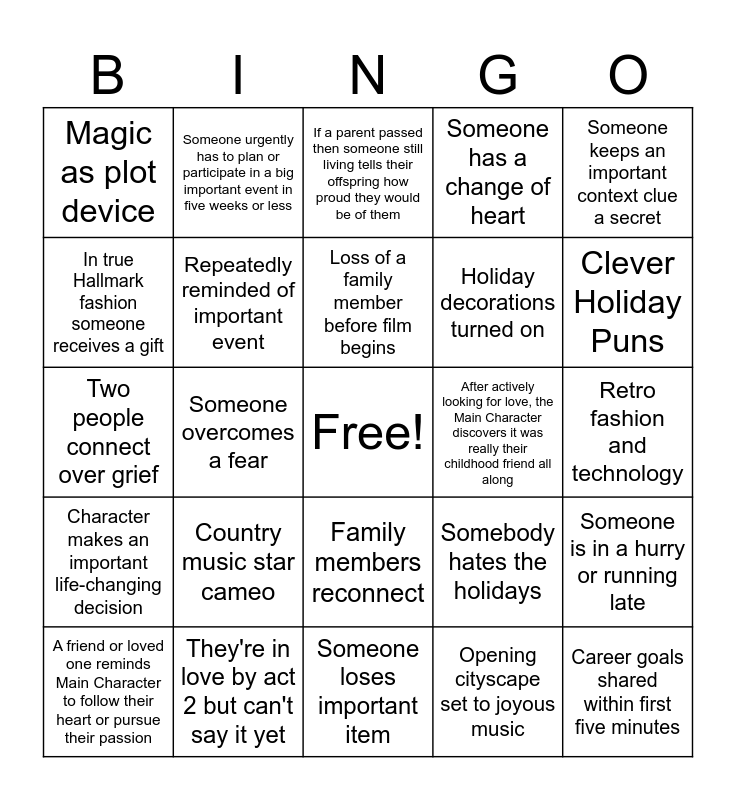This bingo card has a free space and 34 words: Main Character gives up career, hobby, or passion, Opening cityscape set to joyous music, Someone plays piano or guitar, Character returns to hometown after successful career elsewhere, Character makes an important life-changing decision, Repeatedly reminded of important event, Someone keeps an important context clue a secret, A friend or loved one reminds Main Character to follow their heart or pursue their passion, Someone urgently has to plan or participate in a big important event in five weeks or less, Workaholic learns to relax, Loss of a family member before film begins, If a parent passed then someone still living tells their offspring how proud they would be of them, Strangers share a meal, Someone assumes the two leads are a couple, After actively looking for love, the Main Character discovers it was really their childhood friend all along, Clever Holiday Puns, They're in love by act 2 but can't say it yet, Two people connect over grief, Country music star cameo, Somebody hates the holidays, Family members reconnect, On-the-nose music, Magic as plot device, Retro fashion and technology, Someone loses important item, Career goals shared within first five minutes, Someone has a change of heart, A character discovers newfound family, Holiday decorations turned on, In true Hallmark fashion someone receives a gift, Leads almost kiss in act two but get interrupted, Someone overcomes a fear, Someone is in a hurry or running late and Pair that seem at odds have occupations that strangely complement each other.