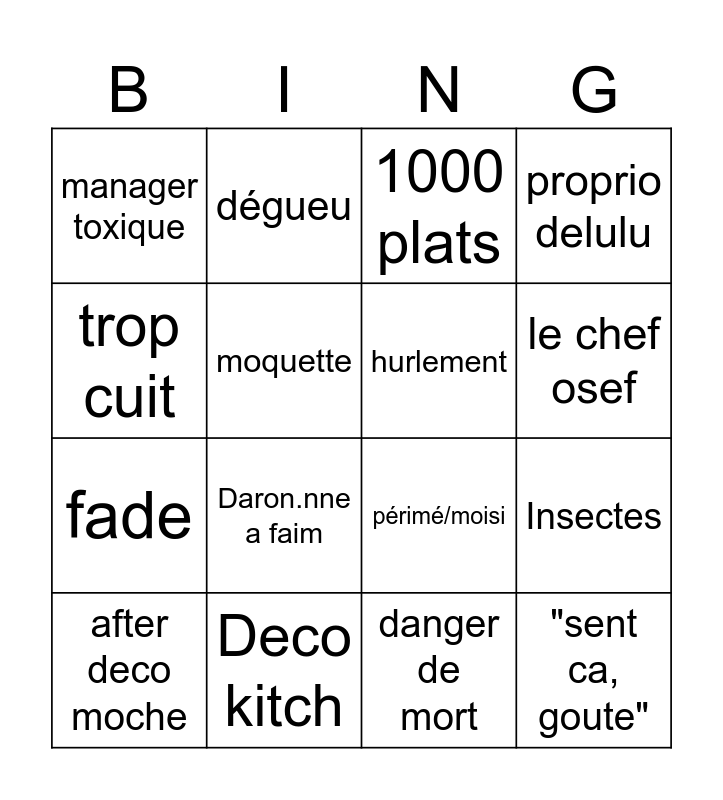 This bingo card has 16 words: Deco kitch, Insectes, 1000 plats, manager toxique, fade, dégueu, périmé/moisi, danger de mort, trop cuit, moquette, after deco moche, proprio delulu, Daron.nne a faim, le chef osef, hurlement and "sent ca, goute".