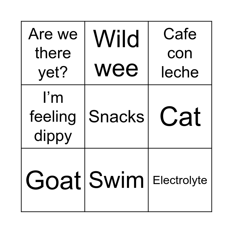 This bingo card has a free space and 8 words: Cat, Cafe con leche, Wild wee, Goat, Are we there yet?, Electrolyte, I’m feeling dippy and Swim.