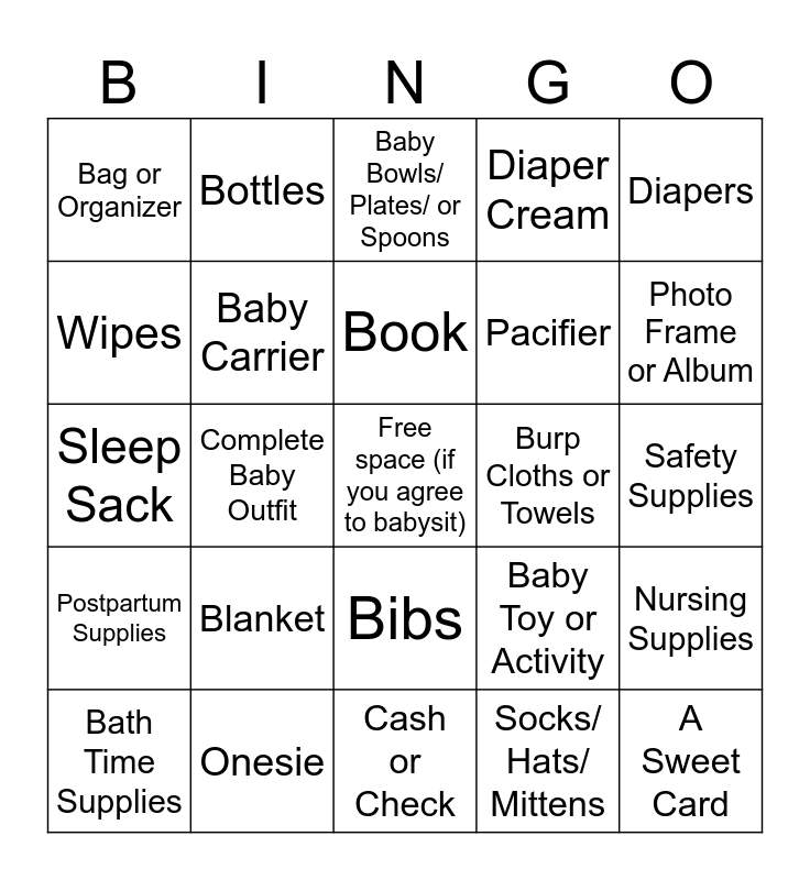 This bingo card has a free space and 24 words: Blanket, Onesie, Book, Bath Time Supplies, Diapers, Bag or Organizer, Wipes, Bottles, Burp Cloths or Towels, Bibs, Pacifier, Sleep Sack, Baby Toy or Activity, Nursing Supplies, Baby Carrier, Socks/ Hats/ Mittens, Safety Supplies, Baby Bowls/ Plates/ or Spoons, Photo Frame or Album, Complete Baby Outfit, A Sweet Card, Postpartum Supplies, Diaper Cream and Cash or Check.