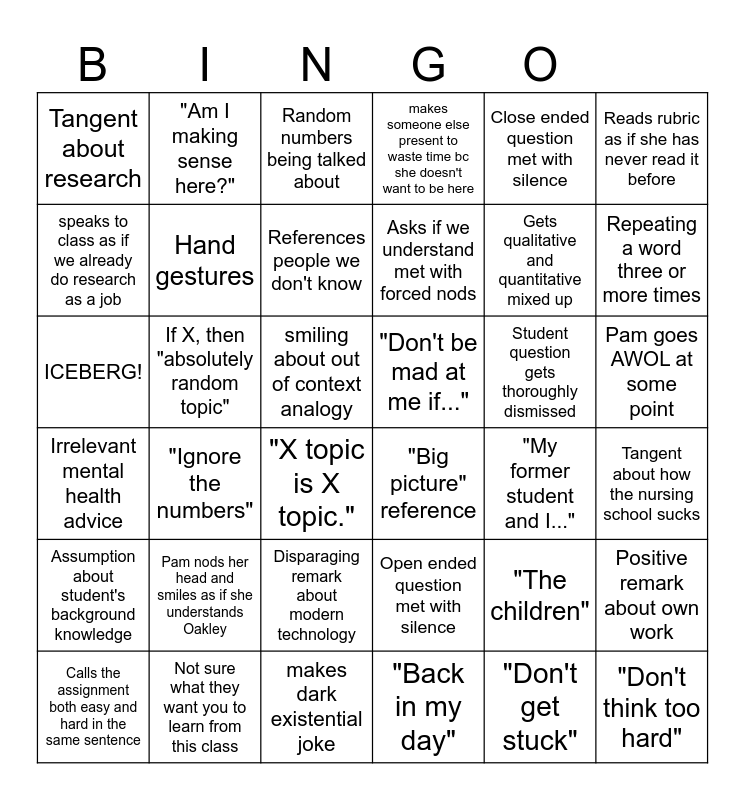 This bingo card has 36 words: Open ended question met with silence, Disparaging remark about modern technology, "Back in my day", speaks to class as if we already do research as a job, Irrelevant mental health advice, "Don't be mad at me if...", Hand gestures, makes dark existential joke, Close ended question met with silence, "The children", Repeating a word three or more times, makes someone else present to waste time bc she doesn't want to be here, Positive remark about own work, If X, then "absolutely random topic", Asks if we understand met with forced nods, Tangent about research, Assumption about student's background knowledge, Student question gets thoroughly dismissed, ICEBERG!, Random numbers being talked about, smiling about out of context analogy, "Ignore the numbers", "Big picture" reference, "X topic is X topic.", "My former student and I...", "Am I making sense here?", Gets qualitative and quantitative mixed up, Not sure what they want you to learn from this class, References people we don't know, Reads rubric as if she has never read it before, "Don't think too hard", Calls the assignment both easy and hard in the same sentence, Tangent about how the nursing school sucks, Pam goes AWOL at some point, Pam nods her head and smiles as if she understands Oakley and "Don't get stuck".