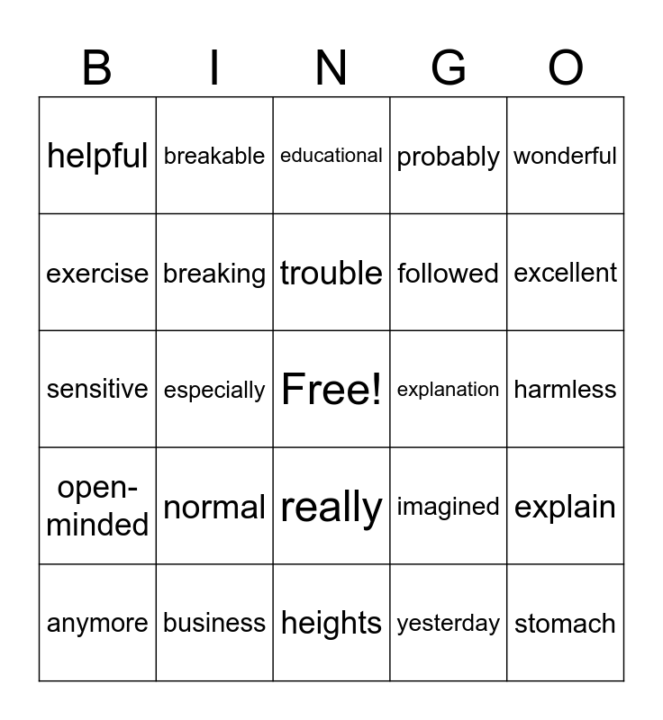 This bingo card has a free space and 24 words: normal, business, trouble, anymore, wonderful, helpful, exercise, breakable, explanation, really, followed, sensitive, imagined, explain, breaking, yesterday, harmless, educational, excellent, especially, stomach, open-minded, probably and heights.