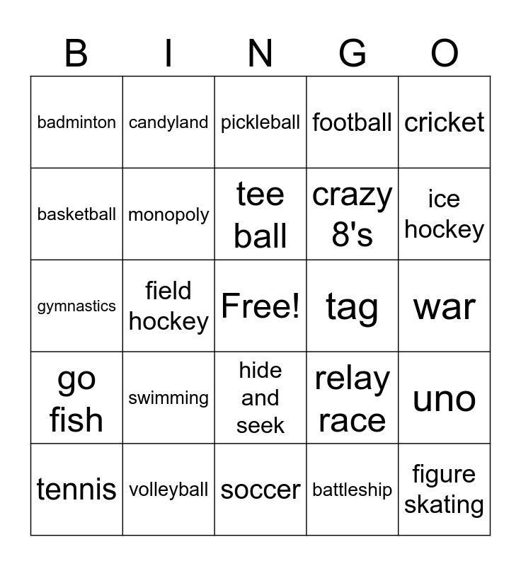 This bingo card has a free space and 24 words: swimming, volleyball, tee ball, tennis, cricket, badminton, basketball, candyland, tag, hide and seek, crazy 8's, gymnastics, relay race, uno, monopoly, battleship, war, pickleball, ice hockey, field hockey, figure skating, go fish, football and soccer.