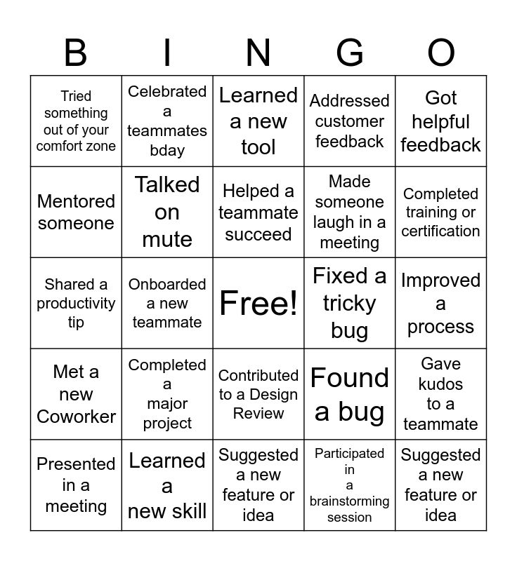 This bingo card has a free space and 24 words: Completed a major project, Learned a new skill, Helped a teammate succeed, Presented in a meeting, Got helpful feedback, Tried something out of your comfort zone, Mentored someone, Celebrated a teammates bday, Fixed a tricky bug, Contributed to a Design Review, Made someone laugh in a meeting, Shared a productivity tip, Found a bug, Gave kudos to a teammate, Talked on mute, Participated in a brainstorming session, Improved a process, Learned a new tool, Completed training or certification, Onboarded a new teammate, Suggested a new feature or idea, Met a new Coworker, Addressed customer feedback and Suggested a new feature or idea.