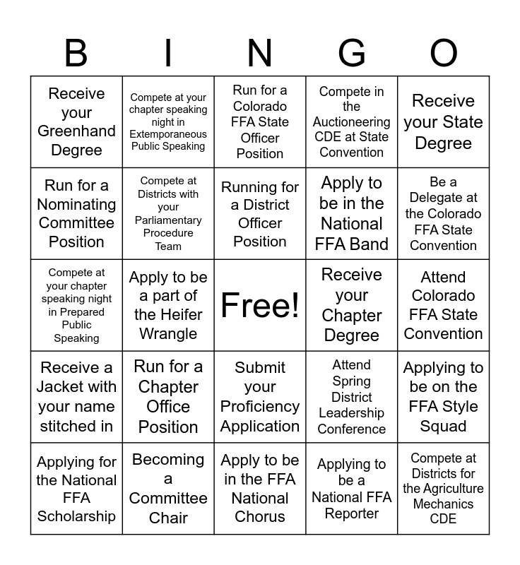 This bingo card has a free space and 24 words: Run for a Chapter Office Position, Becoming a Committee Chair, Running for a District Officer Position, Applying for the National FFA Scholarship, Receive your State Degree, Receive your Greenhand Degree, Run for a Nominating Committee Position, Compete at your chapter speaking night in Extemporaneous Public Speaking, Receive your Chapter Degree, Submit your Proficiency Application, Apply to be in the National FFA Band, Compete at your chapter speaking night in Prepared Public Speaking, Attend Spring District Leadership Conference, Applying to be on the FFA Style Squad, Compete at Districts with your Parliamentary Procedure Team, Applying to be a National FFA Reporter, Attend Colorado FFA State Convention, Run for a Colorado FFA State Officer Position, Be a Delegate at the Colorado FFA State Convention, Apply to be a part of the Heifer Wrangle, Compete at Districts for the Agriculture Mechanics CDE, Receive a Jacket with your name stitched in, Compete in the Auctioneering CDE at State Convention and Apply to be in the FFA National Chorus.