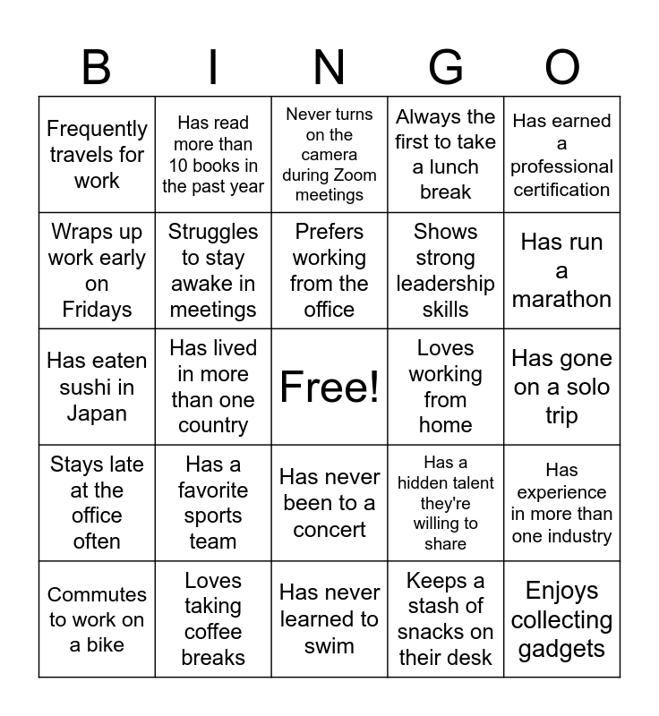 This bingo card has a free space and 60 words: This is their first job, Loves taking coffee breaks, Always arrives early to work, Stays late at the office often, Keeps a stash of snacks on their desk, Has the neatest desk in the office, Struggles to stay awake in meetings, An amazing mentor to others, Shows strong leadership skills, Has worked at the same company for over five years, Always the first to take a lunch break, Has received appreciation from clients, Wraps up work early on Fridays, Stays mostly quiet during office hours, Loves planning office outings, Frequently travels for work, Enjoys collecting gadgets, Has earned a professional certification, Always travels during holidays, Prefers working from the office, Loves working from home, Never turns on the camera during Zoom meetings, Commutes to work on a bike, Has experience in more than one industry, Always hits the gym before work, Has traveled to more than five countries, Has a pet cat, Has a fear of public speaking, Has run a marathon, Has a tattoo, Has never broken a bone, Speaks more than one language fluently, Has a sibling in the same profession, Has been skydiving, Has read more than 10 books in the past year, Has a child under the age of 5, Has performed on stage in front of an audience, Has lived in more than one country, Has volunteered for a charity in the past year, Has eaten sushi in Japan, Has been scuba diving, Has a favorite sports team, Has gone on a solo trip, Has won an award or recognition for their work, Has a hidden talent they're willing to share, Has traveled to a country where they didn't speak the language, Has a favorite hobby they're passionate about, Has eaten something exotic or unusual, Has met a celebrity, Has never been to a concert, Has never learned to swim, Has a favorite book or movie that has changed their life, Has a talent for singing or playing a musical instrument, Has won a contest or competition, Has gone bungee jumping or zip lining, Has never been on a plane, Has tried a food they didn't think they'd like, but ended up loving, Has attended a music festival, Has a favorite board game or video game and Has completed a challenging physical feat, like a marathon or a triathlon.