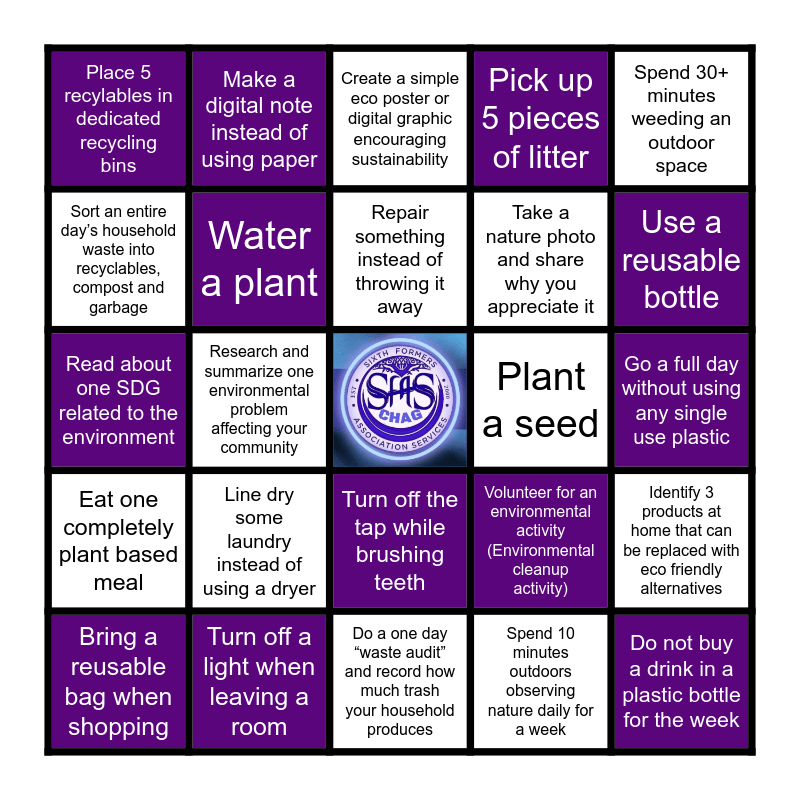 This bingo card has a free space and 24 words: Line dry some laundry instead of using a dryer, Turn off a light when leaving a room, Repair something instead of throwing it away, Bring a reusable bag when shopping, Spend 30+ minutes weeding an outdoor space, Place 5 recylables in dedicated recycling bins, Sort an entire day’s household waste into recyclables, compost and garbage, Make a digital note instead of using paper, Plant a seed, Turn off the tap while brushing teeth, Take a nature photo and share why you appreciate it, Read about one SDG related to the environment, Volunteer for an environmental activity (Environmental cleanup activity), Identify 3 products at home that can be replaced with eco friendly alternatives, Water a plant, Spend 10 minutes outdoors observing nature daily for a week, Go a full day without using any single use plastic, Create a simple eco poster or digital graphic encouraging sustainability, Use a reusable bottle, Research and summarize one environmental problem affecting your community, Do not buy a drink in a plastic bottle for the week, Eat one completely plant based meal, Pick up 5 pieces of litter and Do a one day “waste audit” and record how much trash your household produces.