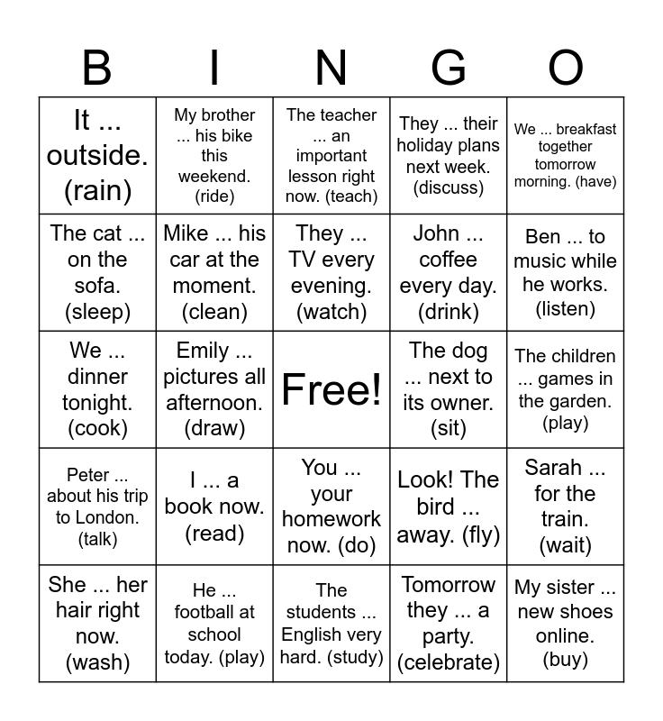 This bingo card has a free space and 24 words: I ... a book now. (read), He ... football at school today. (play), They ... TV every evening. (watch), She ... her hair right now. (wash), We ... breakfast together tomorrow morning. (have), It ... outside. (rain), The cat ... on the sofa. (sleep), My brother ... his bike this weekend. (ride), The dog ... next to its owner. (sit), You ... your homework now. (do), John ... coffee every day. (drink), We ... dinner tonight. (cook), Look! The bird ... away. (fly), Sarah ... for the train. (wait), Mike ... his car at the moment. (clean), Tomorrow they ... a party. (celebrate), The children ... games in the garden. (play), The teacher ... an important lesson right now. (teach), Ben ... to music while he works. (listen), Emily ... pictures all afternoon. (draw), My sister ... new shoes online. (buy), Peter ... about his trip to London. (talk), They ... their holiday plans next week. (discuss) and The students ... English very hard. (study).