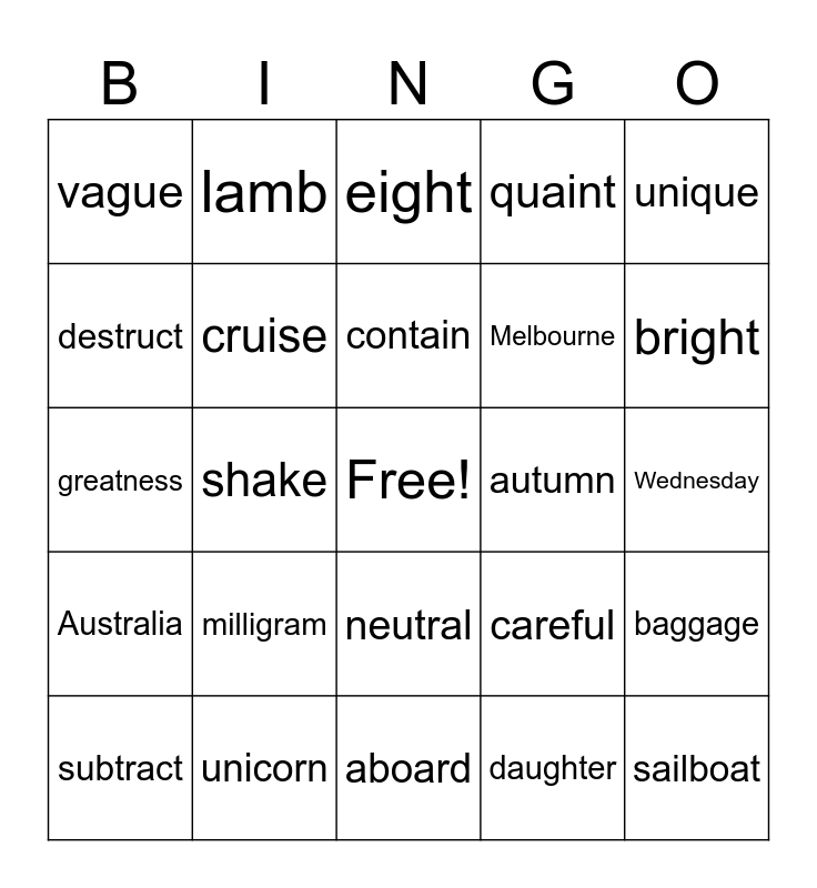 This bingo card has a free space and 24 words: milligram, unicorn, contain, subtract, unique, vague, destruct, lamb, autumn, neutral, Melbourne, greatness, careful, baggage, cruise, daughter, Wednesday, eight, bright, shake, sailboat, Australia, quaint and aboard.