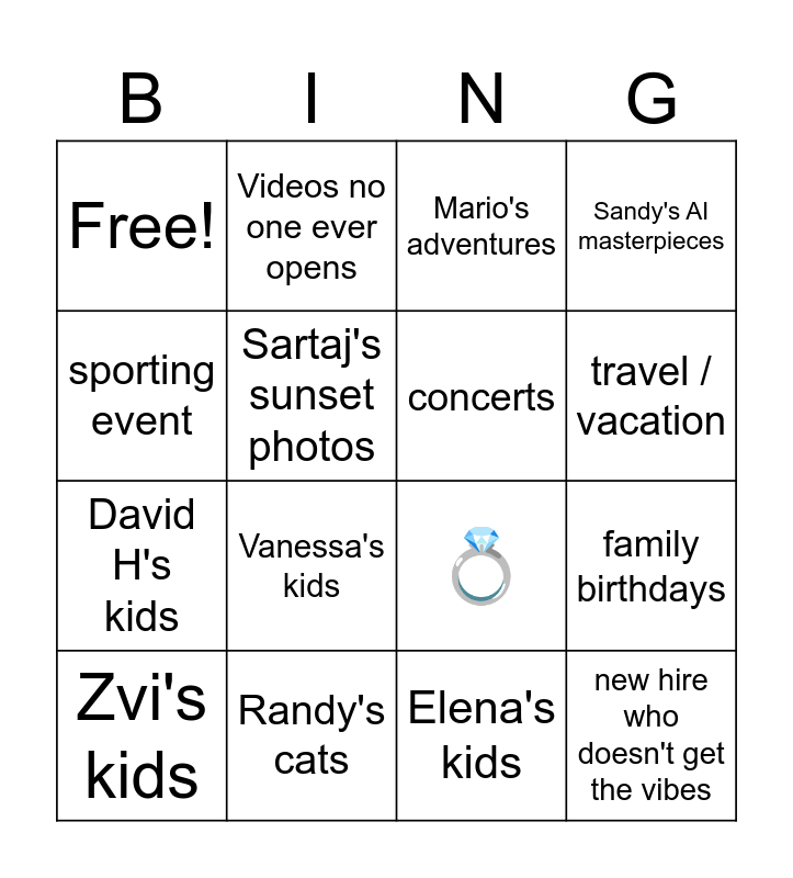 This bingo card has 16 words: Zvi's kids, Randy's cats, Mario's adventures, Sandy's AI masterpieces, sporting event, Videos no one ever opens, 💍, family birthdays, Free!, Sartaj's sunset photos, Elena's kids, travel / vacation, David H's kids, Vanessa's kids, concerts and new hire who doesn't get the vibes.