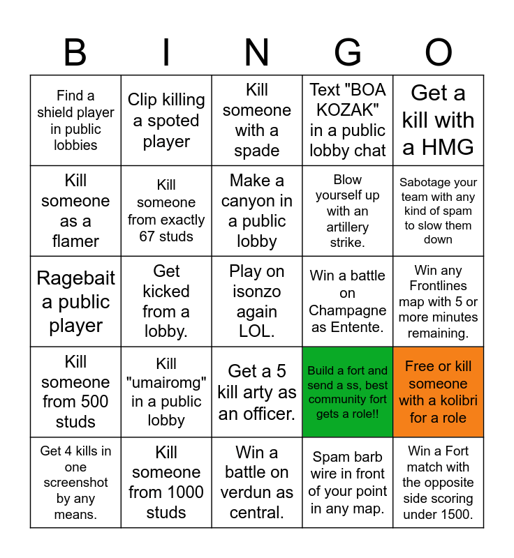 This bingo card has a free space and 24 words: Kill "umairomg" in a public lobby, Kill someone from 1000 studs, Make a canyon in a public lobby, Get 4 kills in one screenshot by any means., Get a kill with a HMG, Find a shield player in public lobbies, Kill someone as a flamer, Clip killing a spoted player, Win a battle on Champagne as Entente., Get a 5 kill arty as an officer., Blow yourself up with an artillery strike., Ragebait a public player, Build a fort and send a ss, best community fort gets a role!!, Free or kill someone with a kolibri for a role, Kill someone from exactly 67 studs, Spam barb wire in front of your point in any map., Win any Frontlines map with 5 or more minutes remaining., Kill someone with a spade, Sabotage your team with any kind of spam to slow them down, Get kicked from a lobby., Win a Fort match with the opposite side scoring under 1500., Kill someone from 500 studs, Text "BOA KOZAK" in a public lobby chat and Win a battle on verdun as central..