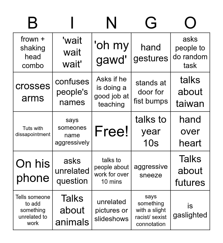 This bingo card has a free space and 30 words: Talks about animals, No food, says someones name aggressively, Has a genuinely heartwarming conversation, frown + shaking head combo, 'oh my gawd', confuses people's names, talks to people about work for over 10 mins, talks to year 10s, unrelated pictures or slideshows, hand over heart, is gaslighted, says something with a slight racist/ sexist connotation, butchers pronounciations, talks about taiwan, 'do you remember the covid', aggressive sneeze, On his phone, asks unrelated question, asks people to do random task, Tuts with dissapointment, 'ahhhhhhhhhhh' solemly, 'wait wait wait', stands at door for fist bumps, crosses arms, hand gestures, Talks about futures, Tells someone to add something unrelated to work, Asks if he is doing a good job at teaching and Tells people to stop having fun.