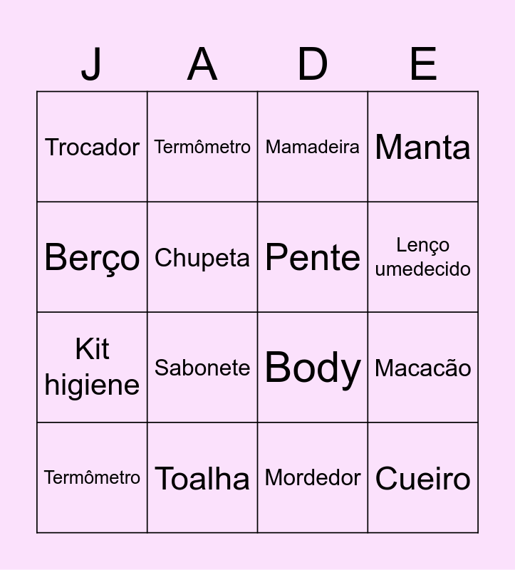 This bingo card has 27 words: Fralda, Pano de boca, Kit higiene, Saída de maternidade, Chupeta, Mamadeira, Termômetro, Cueiro, Toalha, Banheira, Body, Manta, Meias, Shampoo, Sabonete, Pomada, Pente, Lenço umedecido, Canguru, Trocador, Mordedor, Babador, Macacão, Termômetro, Naninha, Berço and Poltrona.