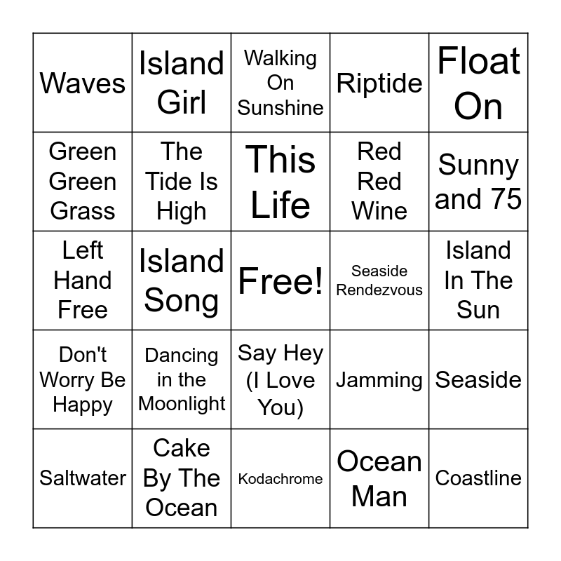 This bingo card has a free space and 70 words: Good Vibrations, Island In The Sun, Under the Boardwalk, Soak Up The Sun, Cake By The Ocean, The Tide Is High, Riptide, Electric Feel, Float On, Blister In The Sun, Seaside, Margaritaville, Waves, Walking On Sunshine, Brighter Than The Sun, Island Song, Say Hey (I Love You), Red Red Wine, Cabin By the Sea, Don't Worry Be Happy, Seaside Rendezvous, Jamming, Sunny and 75, Sand, Tiki Time, Shoot Tequila, Better on a Beach, Salt and Lime, Ocean Man, Coconut, Island Girl, Message In A Bottle, Down Under, Rockaway Beach, Pass The Dutchie, Saturday Sun, I Ain't Worried, Sunrise Chasing, Chasing Sunsets, Green Green Grass, Take It Easy, Dancing in the Moonlight, Coastline, wildflower, Watermelon Sugar, The Tide Is High, Saltwater, Oceans, Shark In The Water, To The Sea, Hawaii Surfer, Three Little Birds, Sunny Weather, Somewhere Over The Rainbow, Kodachrome, Sunshine, Lollipops And Rainbows, This Life, Feels Like Summer, Meet Me At Our Spot, Sundress, Left Hand Free, Malibu, Lovely Day, In the Summertime, Here Comes The Sun, Someday, Pineapple Skies, Heat Waves, Baby, I Love Your Way and Surfin' U.S.A..