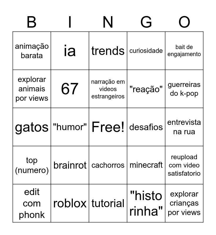 This bingo card has a free space and 24 words: brainrot, roblox, narração em videos estrangeiros, edit com phonk, bait de engajamento, animação barata, explorar animais por views, ia, desafios, cachorros, "reação", gatos, minecraft, reupload com video satisfatorio, 67, "histo rinha", entrevista na rua, trends, guerreiras do k-pop, "humor", explorar crianças por views, top (numero), curiosidade and tutorial.