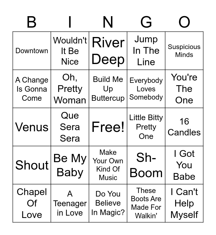 This bingo card has a free space and 29 words: Chapel Of Love, California Dreamin', Que Sera Sera, Hey Lover, Downtown, River Deep, Oh, Pretty Woman, Be My Baby, Little Bitty Pretty One, A Teenager in Love, 16 Candles, I Can't Help Myself, Do You Believe In Magic?, These Boots Are Made For Walkin', You're The One, Put Your Head On My Shoulder, Make Your Own Kind Of Music, Shout, Suspicious Minds, Venus, Sh-Boom, You Don't Own Me, Everybody Loves Somebody, A Change Is Gonna Come, Jump In The Line, Wouldn't It Be Nice, I Got You Babe, Build Me Up Buttercup and Stop! In The Name Of Love.