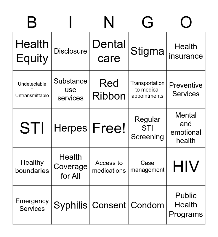 This bingo card has a free space and 29 words: Emergency Services, Chronic Disease Care, Herpes, Outpatient Services, Health Equity, Dental care, Substance use services, Health Coverage for All, Regular STI Screening, Syphilis, Mental and emotional health, Public Health Programs, Consent, Condom, Preventive Services, PrEP, Access to medications, Healthy boundaries, Health insurance, STI, Case management, PEP, Transportation to medical appointments, Undetectable = Untransmittable, Stigma, Disclosure, HIV, Red Ribbon and Act Up.