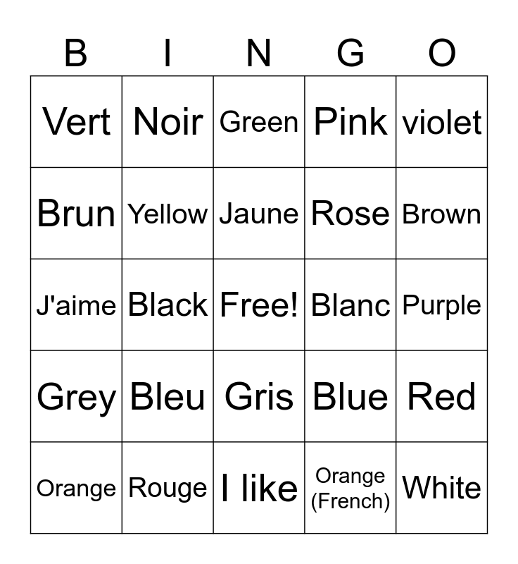 This bingo card has a free space and 24 words: Bleu, Rouge, Jaune, Orange, violet, Vert, Brun, Noir, Blanc, Gris, Rose, J'aime, Blue, Red, Yellow, Orange (French), Purple, Green, Brown, Black, White, Grey, Pink and I like.