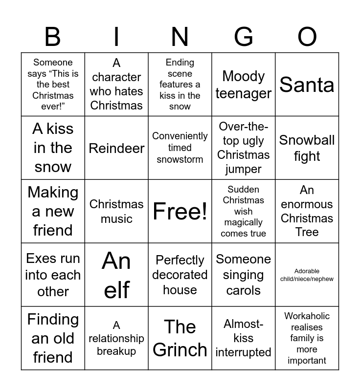 This bingo card has a free space and 28 words: Adorable child/niece/nephew, Character returns to hometown, Over-the-top ugly Christmas jumper, Almost-kiss interrupted, A kiss in the snow, Ending scene features a kiss in the snow, A character who hates Christmas, Exes run into each other, Sudden Christmas wish magically comes true, Finding an old friend, Making a new friend, Moody teenager, A relationship breakup, The Grinch, Snowball fight, Train, An elf, Reindeer, Conveniently timed snowstorm, Perfectly decorated house, Someone says “This is the best Christmas ever!”, Single parent who is TOO perfect, Workaholic realises family is more important, Christmas music, An enormous Christmas Tree, Someone singing carols, Santa and Christmas Shopping.