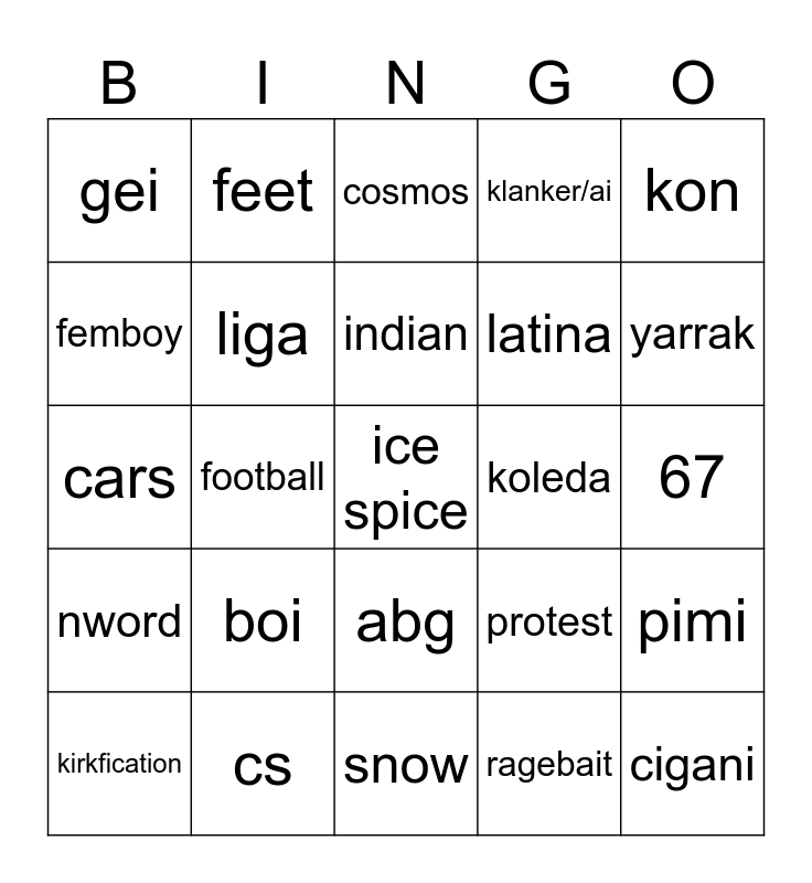 This bingo card has a free space and 24 words: boi, cs, indian, kirkfication, kon, gei, femboy, feet, koleda, abg, latina, cars, protest, pimi, liga, ragebait, 67, cosmos, yarrak, football, cigani, nword, klanker/ai and snow.