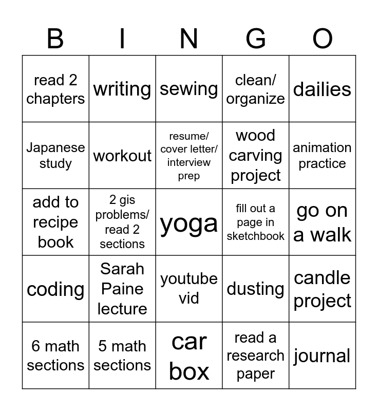 This bingo card has 30 words: 5 math sections, 1 gis problem/ read 1 sections, 2 gis problems/ read 2 sections, read 1 chapter, read 2 chapters, sewing, workout, youtube vid, fill out a page in sketchbook, car box, go on a walk, yoga, read a research paper, journal, animation practice, 3 gis problems/ read 3 sections, dusting, coding, Sarah Paine lecture, dailies, add to recipe book, watch a movie, writing, wood carving project, Japanese study, clean/ organize, candle project, 6 math sections, resume/ cover letter/ interview prep and sit outside for 5 minutes.