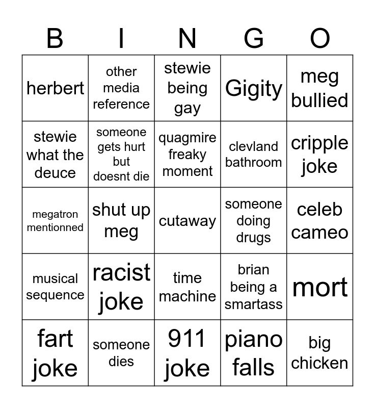 This bingo card has a free space and 24 words: racist joke, someone dies, quagmire freaky moment, fart joke, meg bullied, herbert, stewie what the deuce, other media reference, someone doing drugs, time machine, clevland bathroom, megatron mentionned, brian being a smartass, mort, someone gets hurt but doesnt die, piano falls, celeb cameo, stewie being gay, cripple joke, shut up meg, big chicken, musical sequence, Gigity and 911 joke.