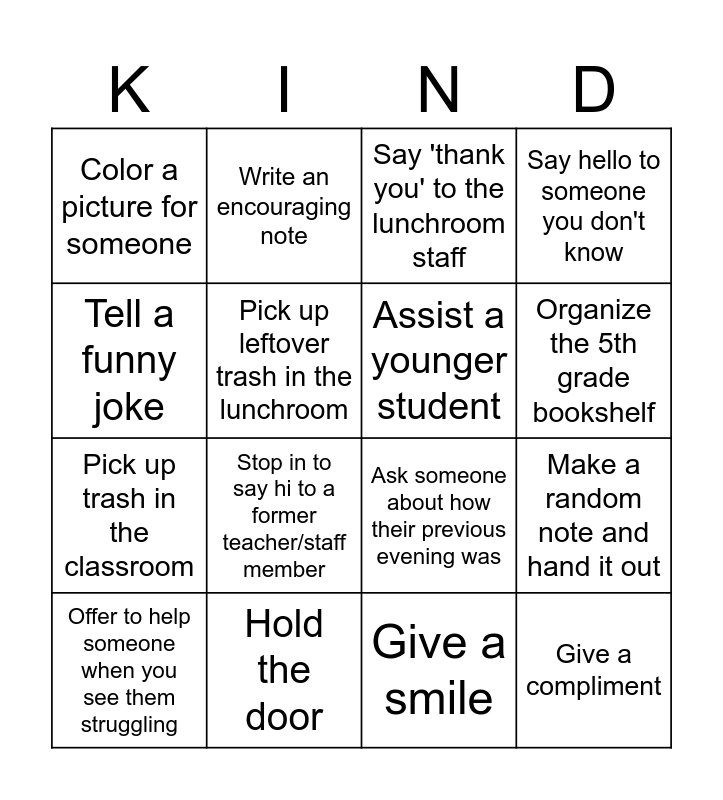 This bingo card has 16 words: Hold the door, Make a random note and hand it out, Say 'thank you' to the lunchroom staff, Color a picture for someone, Pick up trash in the classroom, Write an encouraging note, Ask someone about how their previous evening was, Give a smile, Tell a funny joke, Pick up leftover trash in the lunchroom, Offer to help someone when you see them struggling, Say hello to someone you don't know, Stop in to say hi to a former teacher/staff member, Organize the 5th grade bookshelf, Assist a younger student and Give a compliment.