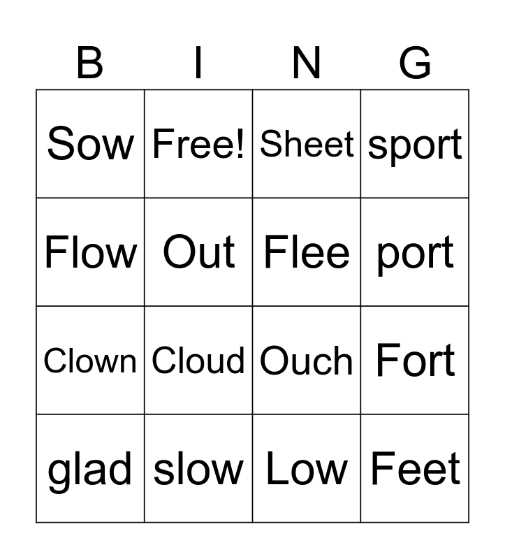 This bingo card has 19 words: Ouch, Shout, Sheet, Feet, Fort, Flow, Low, Sow, Free!, Clown, Cloud, Out, Flee, slow, glad, slee, sport, port and row.