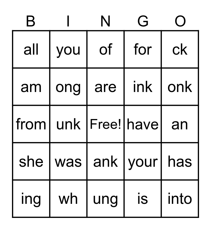 This bingo card has a free space and 29 words: ing, ch, unk, ang, all, of, ong, was, have, wh, an, into, ung, is, onk, th, ank, she, ck, from, your, sh, ink, am, for, you, has, are and here.