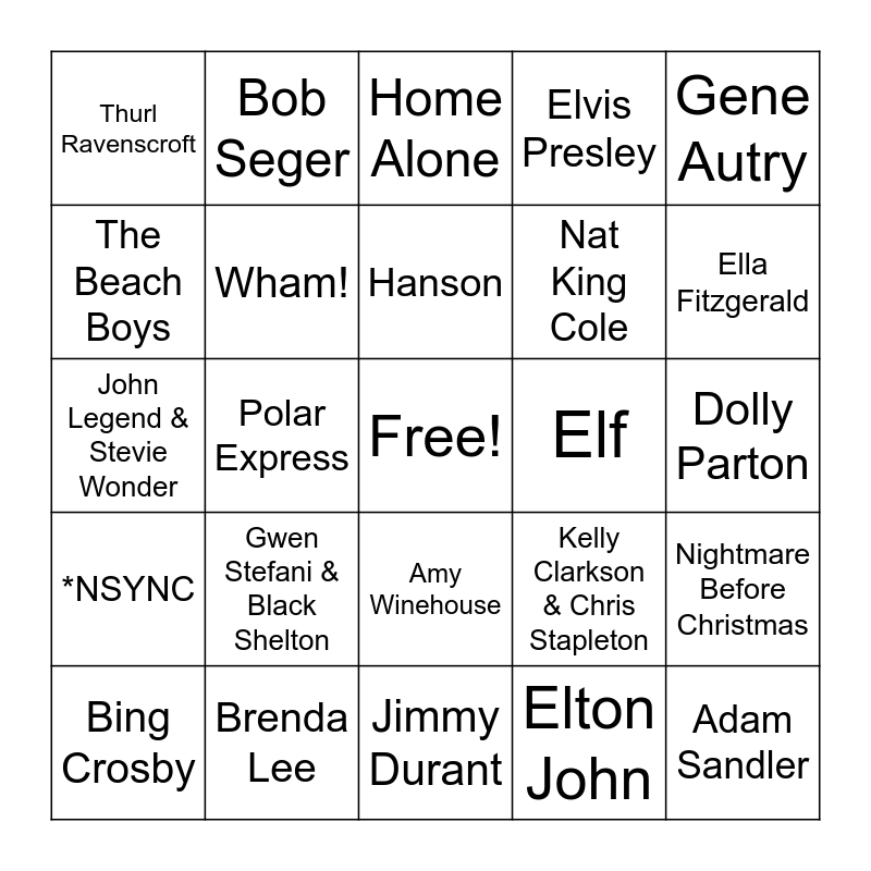 This bingo card has a free space and 61 words: Mariah Carey, Brenda Lee, Michael Bublé, *NSYNC, Elton John, Dean Martin, Wham!, Bobby Helms, Nat King Cole, Chuck Berry, Elvis Presley, Burl Ives, The Beach Boys, Pentatonix, Vince Guaraldi Trio, Thurl Ravenscroft, Adam Sandler, Gene Autry, Alvin & the Chipmunks, Hanson, Elf, Home Alone, Bing Crosby, Nightmare Before Christmas, Tony Bennett, Billy Squier, Bruce Springsteen, Frank Sinatra, Ella Fitzgerald, Carpenters, John Lennon & Yoko Ono, Paul McCartney, Trans-Siberian Orchestra, Tom Petty & the Heartbreakers, Bob Seger, Jon Bon Jovi, No Doubt, Polar Express, Harry Connick Jr., John Legend & Stevie Wonder, She & Him, Gwen Stefani & Black Shelton, Dolly Parton, Eddy Arnold, Kelly Clarkson & Chris Stapleton, Leon Bridges & Norah Jones, Cher & Michael Bublé, Boyz II Men & Brian McKnight, Stevie Wonder, Amy Winehouse, Jimmy Durant, Frozen, Tyler, the Creator, The Nutcracker, Andy Williams, The Jackson 5, Eartha Kitt, Lindsey Stirling, Barbra Streisand, Britney Spears and Band Aid.