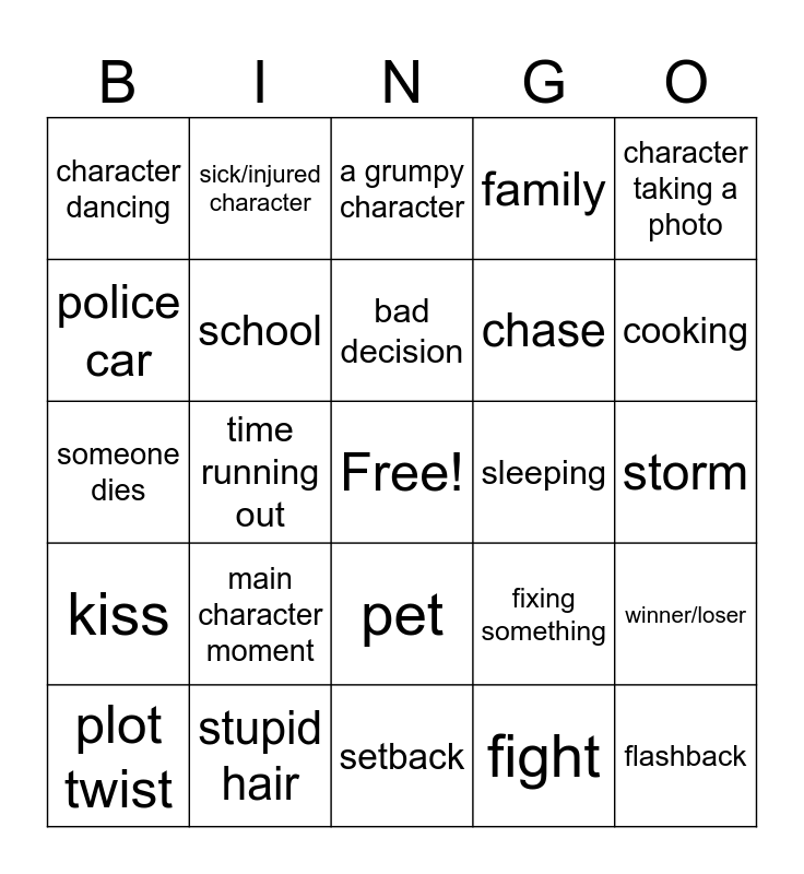 This bingo card has a free space and 24 words: main character moment, stupid hair, bad decision, plot twist, character taking a photo, character dancing, police car, sick/injured character, sleeping, pet, chase, someone dies, fixing something, winner/loser, school, fight, storm, a grumpy character, cooking, time running out, flashback, kiss, family and setback.
