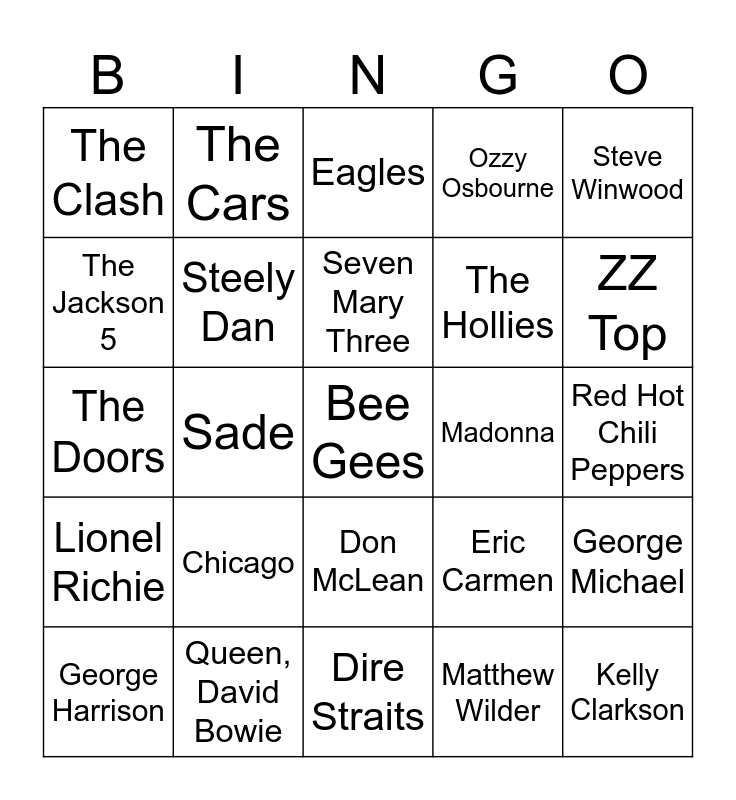 This bingo card has a free space and 39 words: The Beatles, Foreigner, Blue Öyster Cult, Steely Dan, George Harrison, Don McLean, Seven Mary Three, Guns N' Roses, Steve Winwood, Lionel Richie, Sade, Ozzy Osbourne, Kelly Clarkson, Red Hot Chili Peppers, Madonna, Chicago, Christopher Cross, The Clash, Commodores, Eric Carmen, The Jackson 5, Dire Straits, The Hollies, ZZ Top, Bertie Higgins, Mötley Crüe, Paul Simon, Daryl Hall & John Oates, Neil Young, The Cars, Toni Basil, AC/DC, Eagles, Queen, David Bowie, Matthew Wilder, Supergrass, George Michael, The Doors and Led Zeppelin.