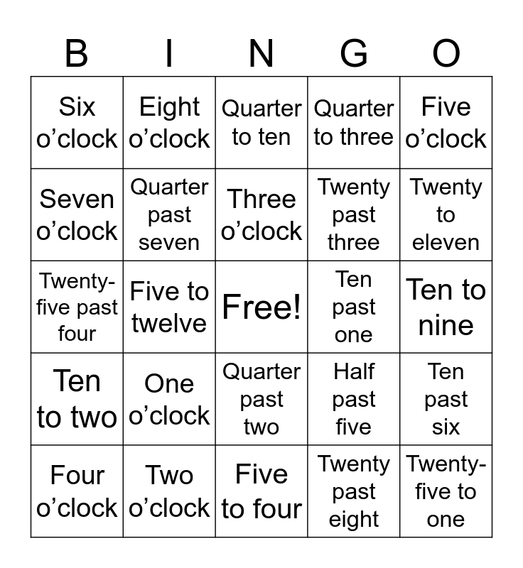 This bingo card has a free space and 24 words: One o’clock, Two o’clock, Three o’clock, Four o’clock, Five o’clock, Six o’clock, Seven o’clock, Eight o’clock, Ten past one, Quarter past two, Twenty past three, Twenty-five past four, Half past five, Ten past six, Quarter past seven, Twenty past eight, Ten to nine, Quarter to ten, Twenty to eleven, Five to twelve, Twenty-five to one, Ten to two, Quarter to three and Five to four.