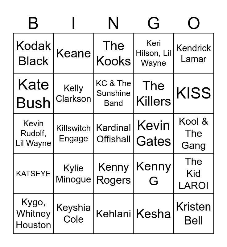 This bingo card has 31 words: Kehlani, Khalid, Killswitch Engage, Kris Kristofferson, Kodak Black, The Kooks, Kelly Clarkson, Kenny G, Kevin Gates, Kesha, Kool & The Gang, Kardinal Offishall, Kristen Bell, Kirko Bangz, KISS, KT Tunstall, The Kid LAROI, Kylie Minogue, KATSEYE, Kenny Rogers, Kendrick Lamar, Keith Urban, Kygo, Whitney Houston, Keane, The Killers, Kate Bush, Keri Hilson, Lil Wayne, Kevin Rudolf, Lil Wayne, Keyshia Cole, KC & The Sunshine Band and Keith Sweat.