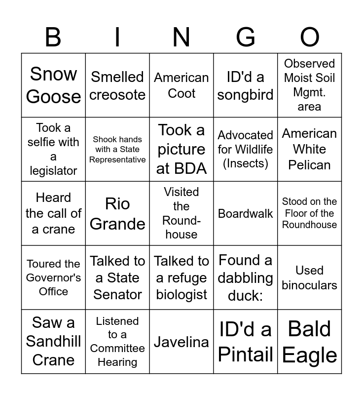 This bingo card has a free space and 29 words: Saw a Sandhill Crane, Sat in a Committee Room, Rio Grande, Mule Deer, Snow Goose, American Coot, Shook hands with a State Representative, Talked to a State Senator, Boardwalk, Listened to a Committee Hearing, Stood on the Floor of the Roundhouse, Bald Eagle, Javelina, ID'd a Pintail, American White Pelican, Black phoebe, Talked to a refuge biologist, Toured the Governor's Office, Observed Moist Soil Mgmt. area, Heard the call of a crane, Found a dabbling duck:, Found a diving duck:, Advocated for Wildlife (Insects), Took a selfie with a legislator, ID'd a songbird, Smelled creosote, Used binoculars, Took a picture at BDA and Learned about State Government.