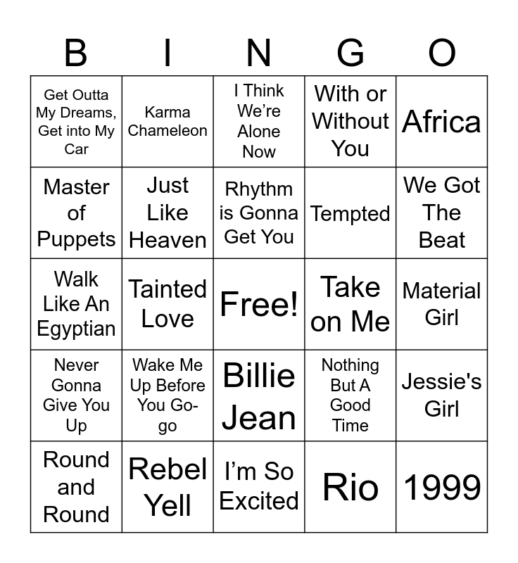 This bingo card has a free space and 29 words: Round and Round, Lose Your Love, Tainted Love, Owner of A Lonely Heart, Get Outta My Dreams, Get into My Car, I Think We’re Alone Now, Just Like Heaven, Wake Me Up Before You Go-go, Take on Me, Rebel Yell, Material Girl, 1999, I’m So Excited, Rio, We Got The Beat, Let’s Hear It For The Boy, Billie Jean, Never Gonna Give You Up, Africa, Walk Like An Egyptian, Nothing But A Good Time, Jump, Tempted, Master of Puppets, With or Without You, Karma Chameleon, Jessie's Girl, Rhythm is Gonna Get You and Hysteria.