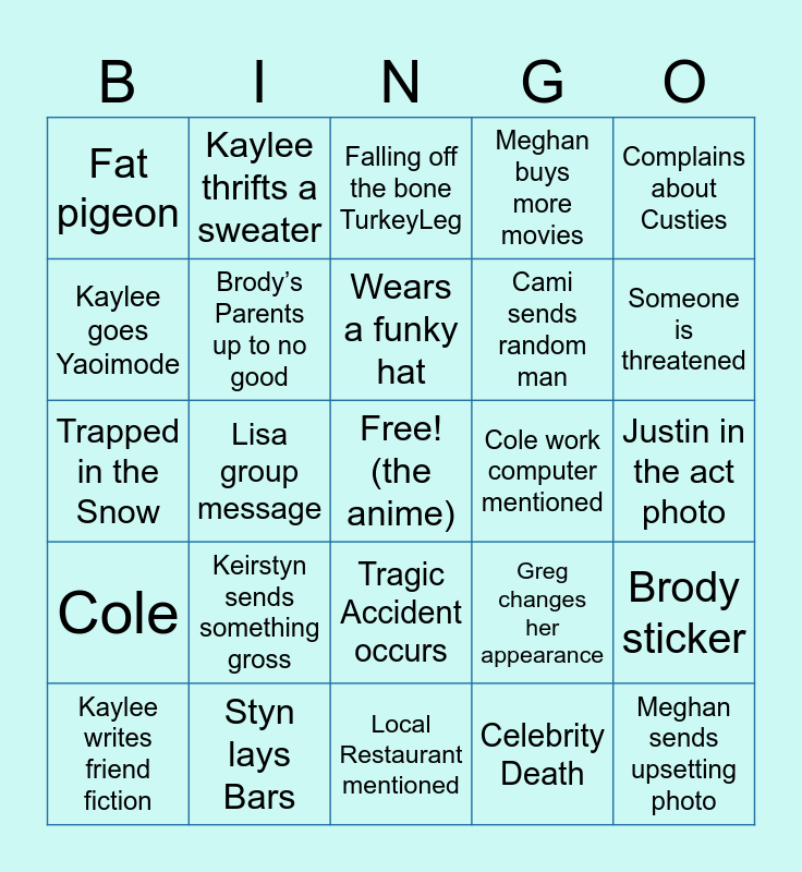 This bingo card has a free space and 29 words: Kaylee writes friend fiction, Daphne stuns, Lisa group message, Emmett sends crazy text, Fat pigeon, Falling off the bone TurkeyLeg, Brody’s Parents up to no good, Keirstyn sends something gross, Cole work computer mentioned, Styn lays Bars, Justin in the act photo, Meghan sends upsetting photo, Local Restaurant mentioned, Celebrity Death, Someone is threatened, Cartoon character with quote, Tragic Accident occurs, Cole, Complains about Custies, Trapped in the Snow, Greg changes her appearance, Brody says good morning, Cami sends random man, Kaylee goes Yaoimode, Meghan buys more movies, Kaylee thrifts a sweater, Brody sticker, Wears a funky hat and Cole sends out of context photo.