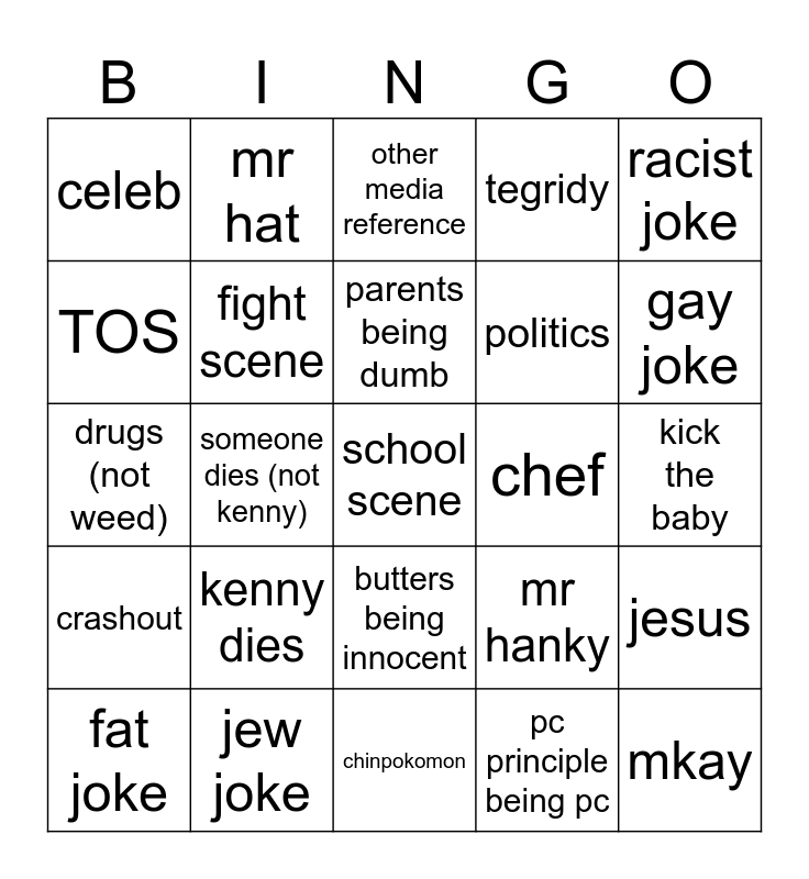 This bingo card has a free space and 24 words: kenny dies, jew joke, parents being dumb, fat joke, racist joke, celeb, TOS, mr hat, chef, butters being innocent, politics, drugs (not weed), mr hanky, jesus, fight scene, pc principle being pc, kick the baby, other media reference, gay joke, someone dies (not kenny), mkay, crashout, tegridy and chinpokomon.