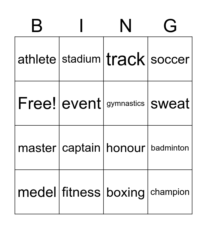 This bingo card has 16 words: fitness, badminton, track, athlete, master, stadium, honour, boxing, Free!, event, medel, soccer, captain, sweat, gymnastics and champion.