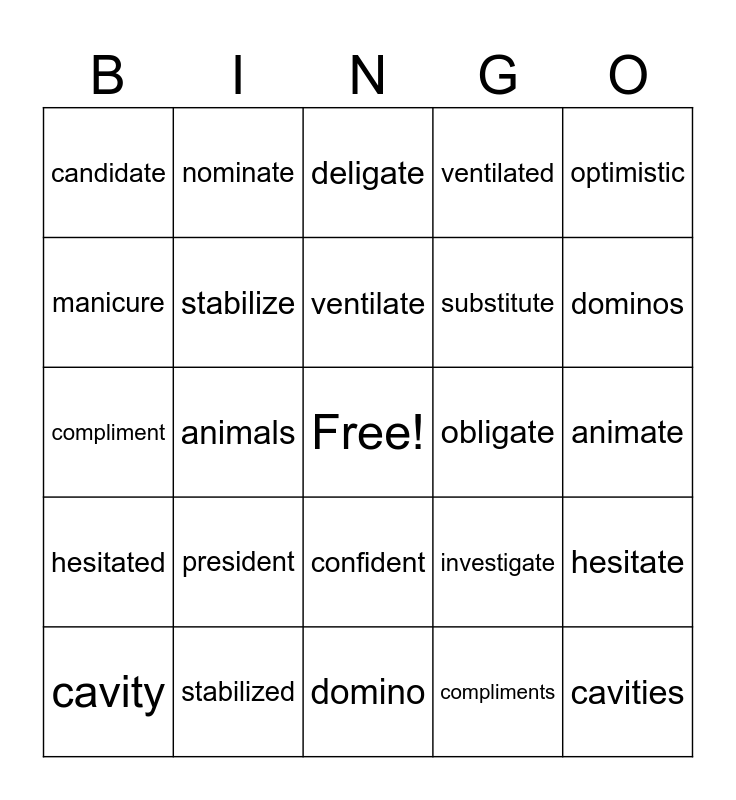 This bingo card has a free space and 25 words: president, domino, ventilate, cavity, optimistic, candidate, manicure, nominate, obligate, confident, substitute, compliment, investigate, hesitate, stabilize, animal, animate, deligate, dominos, animals, cavities, stabilized, hesitated, ventilated and compliments.