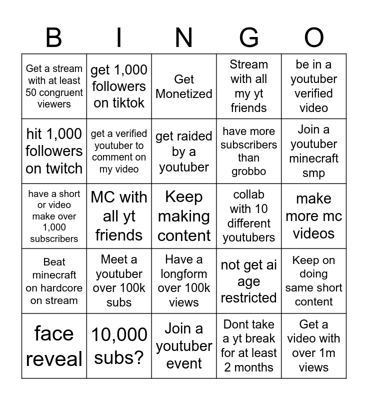 This bingo card has a free space and 24 words: Meet a youtuber over 100k subs, 10,000 subs?, get raided by a youtuber, face reveal, be in a youtuber verified video, Get a stream with at least 50 congruent viewers, hit 1,000 followers on twitch, get 1,000 followers on tiktok, collab with 10 different youtubers, Have a longform over 100k views, have more subscribers than grobbo, have a short or video make over 1,000 subscribers, not get ai age restricted, Keep on doing same short content, get a verified youtuber to comment on my video, Dont take a yt break for at least 2 months, make more mc videos, Get Monetized, Join a youtuber minecraft smp, MC with all yt friends, Get a video with over 1m views, Beat minecraft on hardcore on stream, Stream with all my yt friends and Join a youtuber event.
