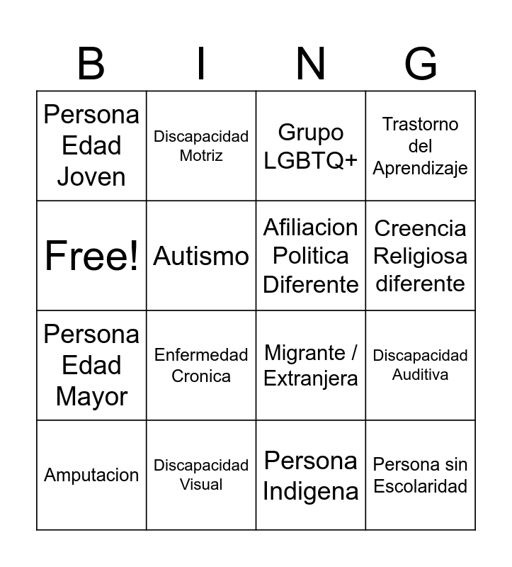 This bingo card has 16 words: Discapacidad Visual, Discapacidad Auditiva, Grupo LGBTQ+, Persona Edad Joven, Persona Edad Mayor, Discapacidad Motriz, Migrante / Extranjera, Persona Indigena, Free!, Autismo, Amputacion, Trastorno del Aprendizaje, Enfermedad Cronica, Creencia Religiosa diferente, Afiliacion Politica Diferente and Persona sin Escolaridad.