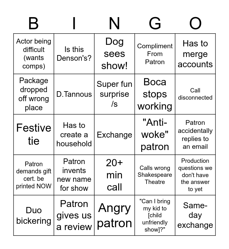 This bingo card has a free space and 52 words: J. Diamond, Same-day exchange, Patron can't log in / website issues, Angry patron, Patron invents new name for show, Patrons pitches a show, Is this Denson's?, Someone starts a debate, Package dropped off wrong place, Crazy request during Will Call, D.Tannous, Patron gives their life story, Production questions we don't have the answer to yet, Calls wrong Shakespeare Theatre, Wants tix to show that has closed, Delayed curtain, Super fun surprise /s, "Anti-woke" patron, Mark patron "deceased", Has to merge accounts, Has to create a household, "Can I bring my kid to [child unfriendly show]?", Actor being difficult (wants comps), Boca stops working, Tess stops working, Craziness at CapOne Arena, Book gets sold/Pickup, Forward call to manager, Call disconnected, Maureen mentions prior job, Paranormal Activity ticket sold, Compliment From Patron, Treated to a treat!, Sell a pkg/sub, Funny email address, Dog sees show!, Patron gives us a review, Barry B. SSB, Patron Drip, KenCen name drop, Ugly sweater, Patron accidentally replies to an email, Patron demands gift cert. be printed NOW, Wendell Pierce thirst, 20+ min call, Office supply goes missing, Festive hat, Festive tie, Festive jewelry, Patron w/ celeb name, Duo bickering and Patron conference call.